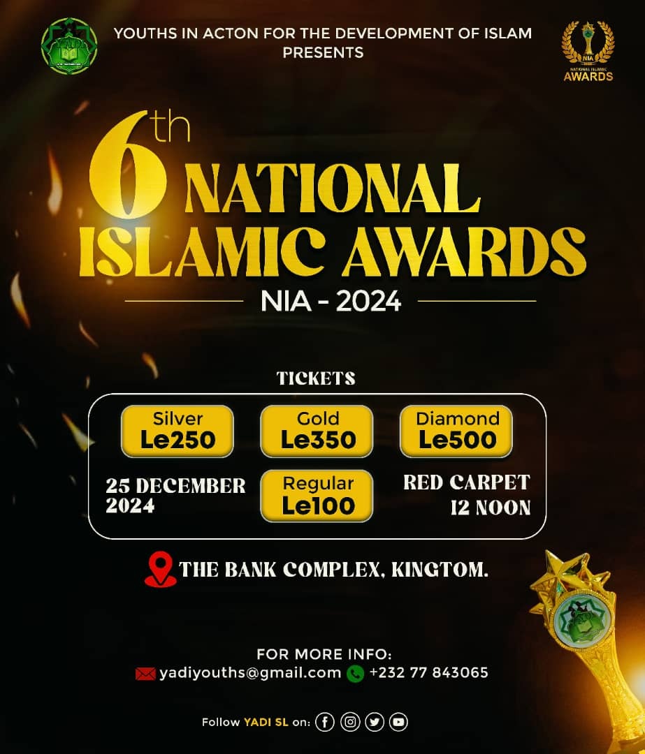 The NIA is the most prestigious and anticipated Islamic event in Sierra Leone. It is an initiative born from the urge of reviving the sunnah of thankfulness and appreciation. NIA was started in 2017 and aims to appreciate, promote and motivate Muslims and Islamic institutions nationwide through an inclusive awards ceremony. YADI discovered the need to express acknowledgement and celebrate Islamic role models and institutions through this award ceremony. NIA serves as a catalyst for encouraging the retention of Islamic teachings and the preservation of its cultural heritage by showcasing the beautiful image of Islam.